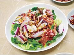 賢太郎さんのこの日のサラダ。たっぷりの葉物にチーズや生ハム、ラディッシュをのせて。