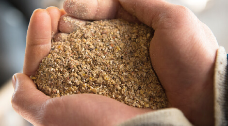 飼料は、遺伝子組み換え作物の混入を防ぐため分別生産流通管理済みのトウモロコシを中心に、大豆かすや麦などを独自に配合したもの。発育に応じて配合を変え、栄養バランスを整えています。