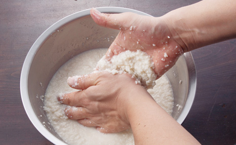 ③約40℃のお湯1Lをまんべんなくかけて麹を軟化させます。30分~1時間程度室温に置いた後、両手ですり合わせて粘りを出し、ミルク状にする。